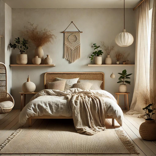 The key to this look is keeping things simple and balanced. Start with a neutral bed as your base, then add one main focal point on the wall (like macrame or woven decor).